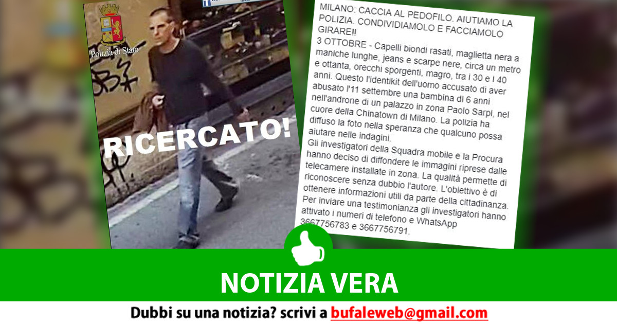 Ci segnalano un post pubblicato il 3 ottobre 2017 sulla pagina Facebook Noi poliziotti per sempre: MILANO: CACCIA AL PEDOFILO. AIUTIAMO LA POLIZIA. CONDIVIDIAMOLO E FACCIAMOLO GIRARE!! 3 OTTOBRE – Capelli biondi rasati, maglietta nera a maniche lunghe, jeans e scarpe nere, circa un metro e ottanta, orecchi sporgenti, magro, tra i 30 e i 40 anni. […]