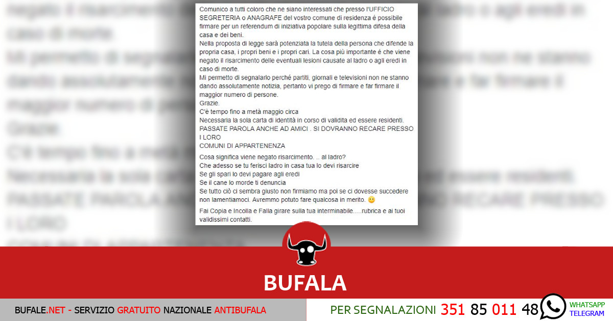 Per l’ennesima volta torniamo a parlare del referendum sulla legittima difesa disponibile presso l’Ufficio Segreteria o Anagrafe del proprio Comune di residenza. Anche questa volta, ovviamente, dobbiamo parlare di bufala condivisa solamente per obbedire passivamente al comando copia e incolla sulla tua bacheca: Ciò che scrivevamo in una nostra vecchia smentita del 2017 vale sempre: la bufala parte […]