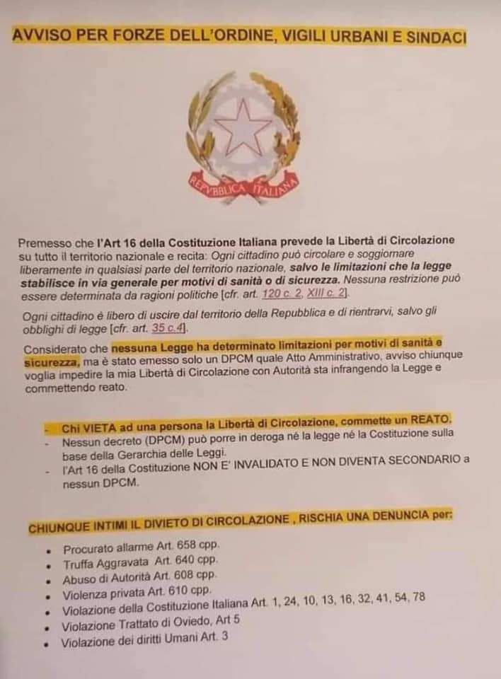 TENETELO CON VOI NEL CELLULARE NEL CASO DOVESTE DECIDERVI A FARE UN GIRO Sapete, perchè non ci sono controlli sulle strade, e le forze del Ordine hanno fatto 2 passi indietro? CODICE Penale Art. 605 Chiunque priva taluno della libertà personale è punito con la reclusione da sei mesi a otto anni. La pena è della reclusione da uno a dieci anni, se il fatto è commesso da un pubblico ufficiale, con abuso dei poteri inerenti alle sue funzioni. QUINDI SE QUALCUNO VI FERMA: PRIMA COSA CHIEDERE DI IDENTIFICARSI CON TESSERINO E SCRIVERVI CHI È, CHE DOVRETE DENUNCIARE, POI FATE PRESENTE CHE: 1. I DPCM SON STATI DECRETATI NULLI DAL TAR DEL LAZIO E TRIBUNALE DI ROMA 2. IL D. L. DEL 21.12 PARLA DI STATO NECESSITÀ E NON QUANTIFICA MULTE 3. DITE CHE QUALUNQUE COSA VI ADDEBITINO OLTRE CHE NON PAGHERETE, FARETE UNA CONTRO DENUNCIA, ABUSO DI POTERE. Le forze dell’ordine devono agire IN FORZA DI LEGGE E NON IN FORZA DI AUTORITÀ. Han giurato sulla Costituzione e ogni dpcm di Conte per lo “stato di emergenza” è incostituzionale. Se avete questa consapevolezza e determinazione NON DOVETE TEMERE NULLA! Buon viaggio ovunque vogliate andare.