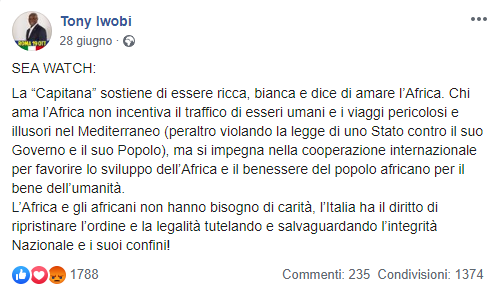 Per trovare un riscontro sulle parole attribuite a Tony Iwobi su Carola Rackete, come riporta Il Giornale, dobbiamo spostarci sulla pagina Facebook ufficiale del senatore e troviamo una fonte il 28 giugno:
