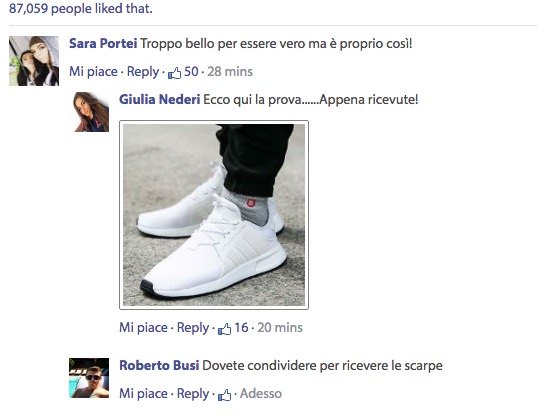 Ender (bel nick) ci segnala questa catena di Sant’Antonio/truffa che sta girando sul web: promette di regalare 5000 paia di scarpe @adidas per l’80º anniversario dell azienda (che ha 70 anni circa).