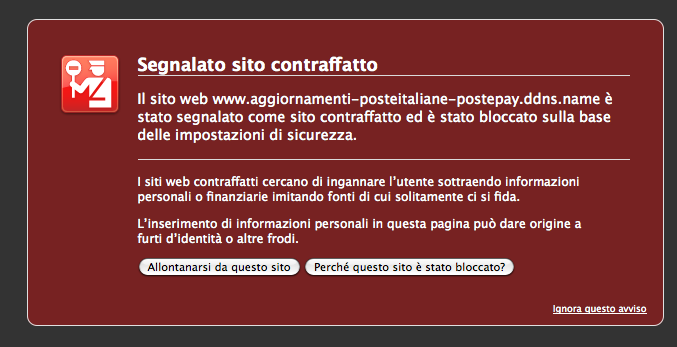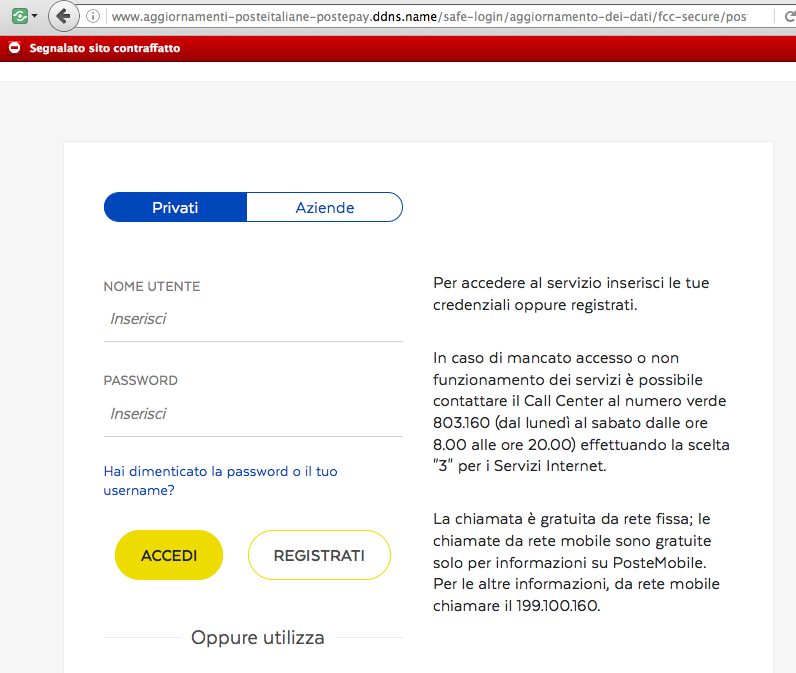 Non www.poste.it ma un sito orriblilmente lungo ed insensato, aggiornamenti-posteitaliane-postepay.ddns.name, ottenuto abusando dei (sia pur legittimi per altri usi) servizi di redirect, di “apertura di un sito gratis o a poco prezzo”.