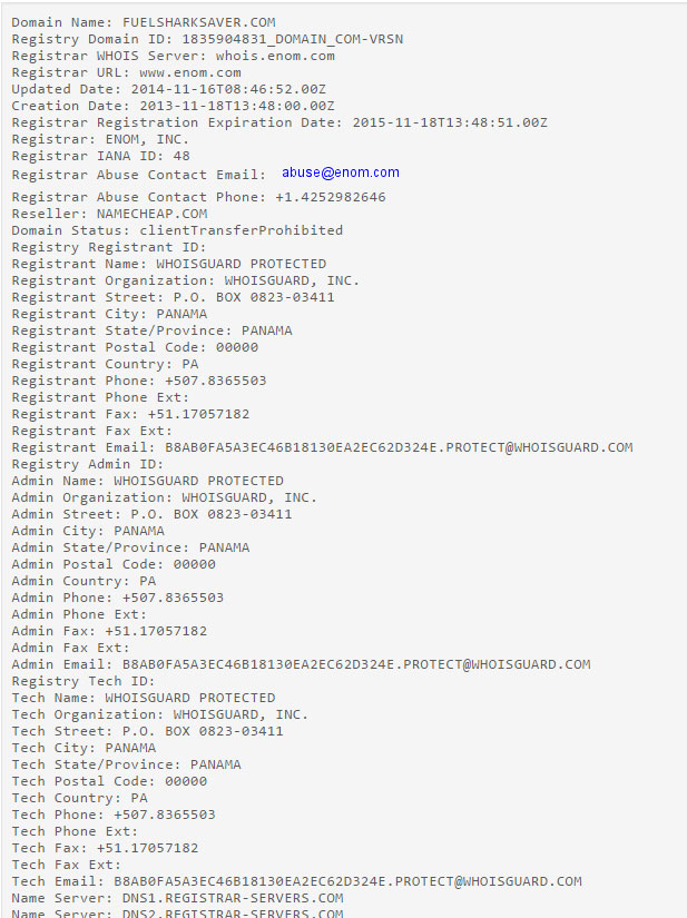 Inoltre, i siti che pubblicizzano il prodotto “Fuel Sharp Saver” hanno il Whois oscurato, quindi è al momento impossibile verificare a quale società è collegata la vendita del prodotto. Normalmente una società che vende i propri prodotti online non si nasconde dietro il Whois.