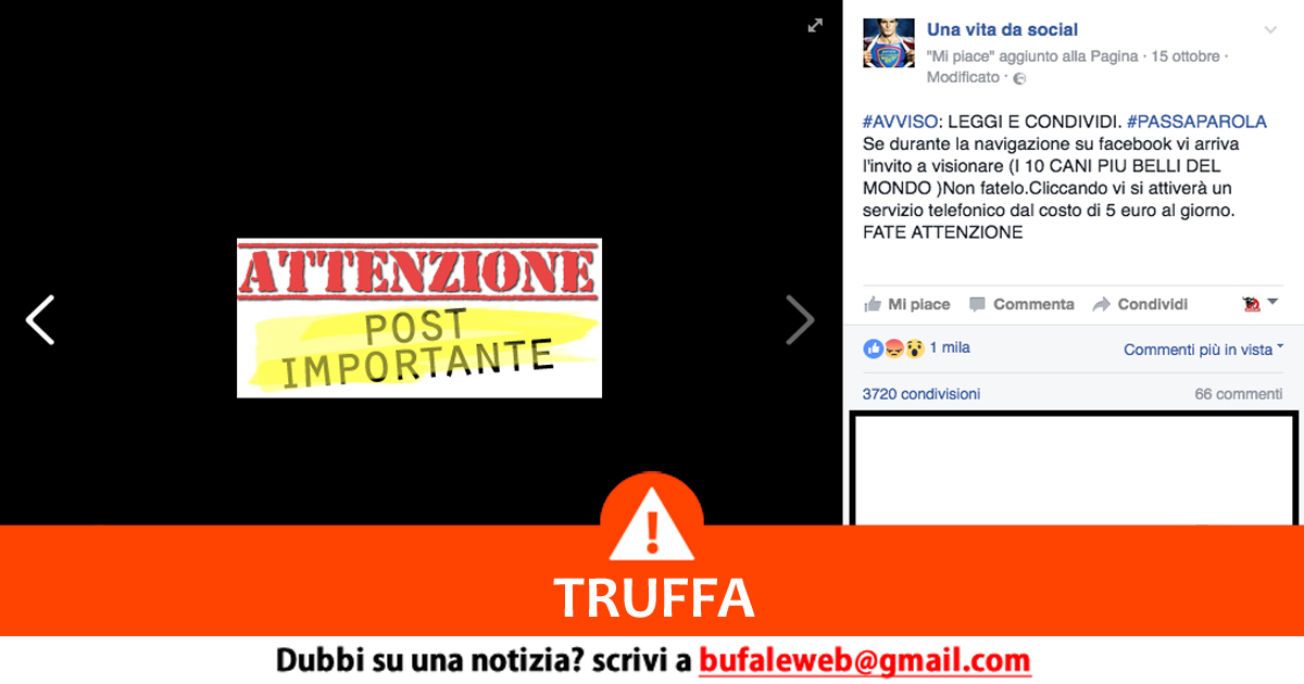 Se durante la navigazione su facebook vi arriva l’invito a visionare (I 10 CANI PIU BELLI DEL MONDO )Non fatelo.Cliccando vi si attiverà un servizio telefonico dal costo di 5 euro al giorno. FATE ATTENZIONE