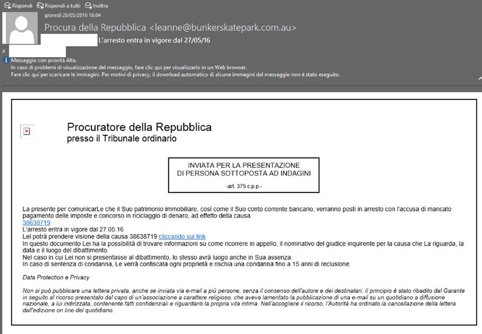 – l’indirizzo di posta elettronica del mittente non c’entra niente con la Procura (XXX@bunkerskatepark.com.au: il dominio dell’indirizzo email fa riferimento a un parco per skateboard di Braeside, in Australia!);