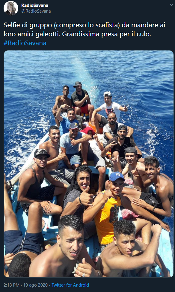 Radio Savana, del resto, è solita pubblicare contenuti decontestualizzati e riproposti nella classica chiave di lettura messa in atto per generare indignazione. Nella maggior parte dei casi i suoi tweet sono bufale, fanno disinformazione o – peggio ancora – non hanno fonti. Il 19 agosto proprio Radio Savana sosteneva che un filmato che mostrava un gruppo di persone in clima festante fosse girato a Lampedusa, e il dibattito si spostava sul distanziamento sociale nella classica chiave di lettura: “italiani sanzionati, loro fanno quello che vogliono”. Addirittura Radio Savana sosteneva che quei ragazzi dicessero: “Non ce ne andremo mai dall’Italia”, anche se i soggetti del filmato parlavano arabo.
