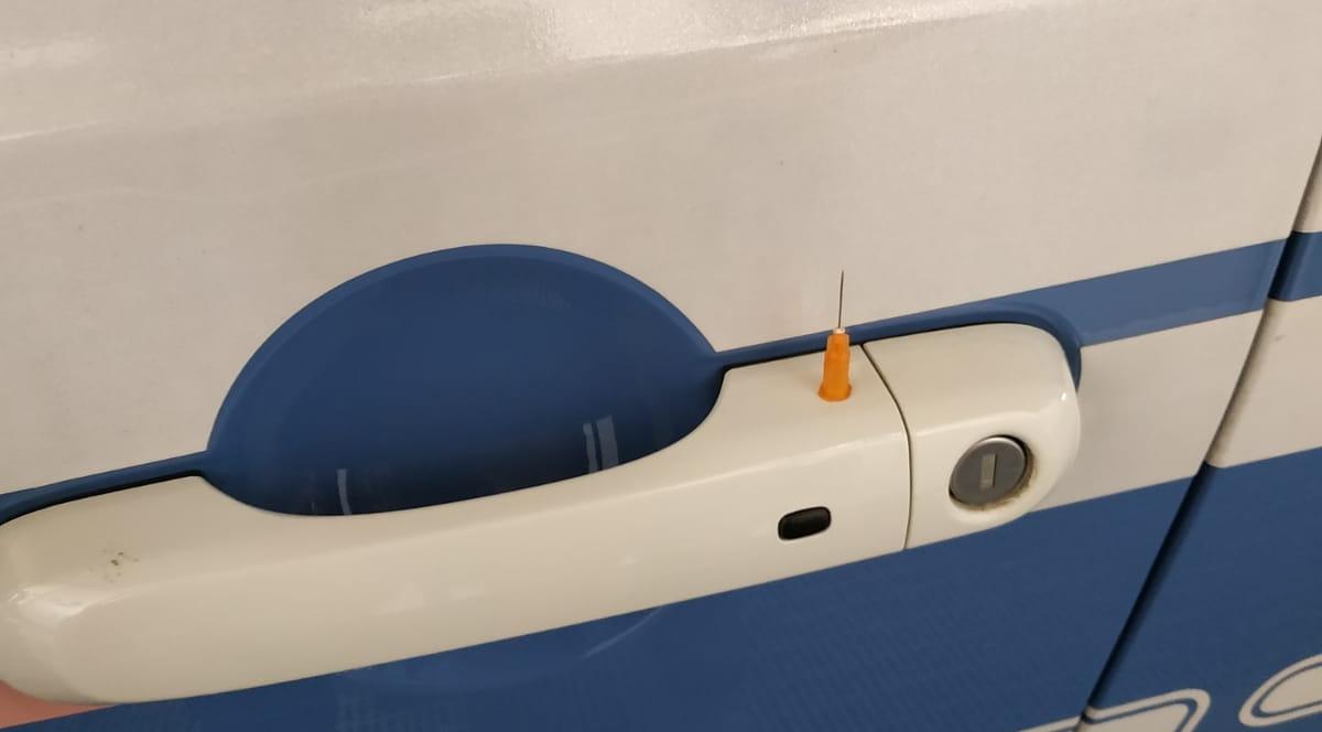 Un ago di siringa sulla portiera della polizia: la foto è del 2019, l’uomo era stato preso
