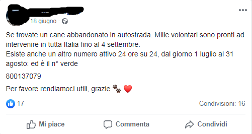 Il numero verde pubblicato da un utente su Facebook dal 18 giugno infatti, era, e sottolineiamo era, un numero reale messo a disposizione dall’ENPA proprio per segnalare i cani abbandonati, ma purtroppo non è più attivo da anni.