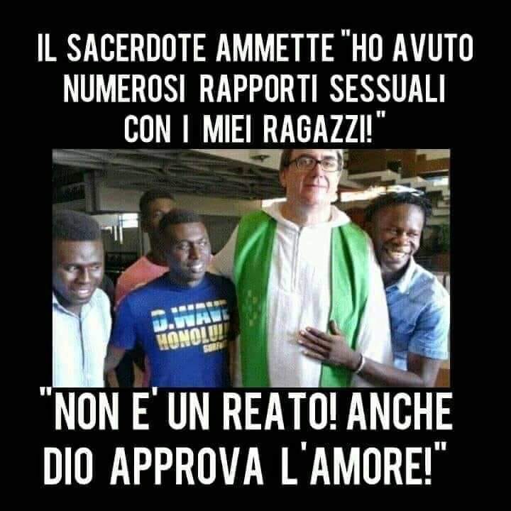 Per questo, qualsiasi notizia riguardi un accadimento del genere, fa sempre molto scalpore. È quello che deve aver pensato chi ha realizzato la foto-meme che mostra un sacerdote con dei migranti di colore, in cui si “autodenuncia”, senza pentimento, di aver fatto sesso.