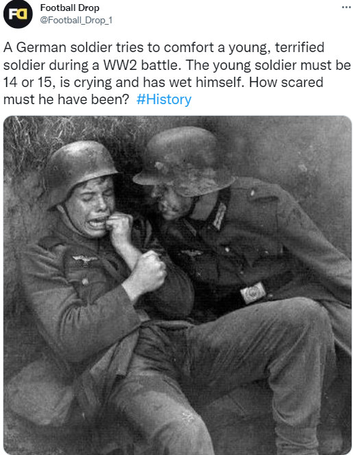 Una foto pubblicata sui social viene descritta come l’immagine di un soldato tedesco immortalato nell’atto di consolare un suo compagno di servizio terrorizzato dalla guerra. Siamo nella Seconda Guerra Mondiale, ed effettivamente vediamo un giovanissimo militare in lacrime con al suo fianco un soldato che gli dice qualcosa.