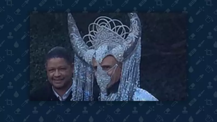 In realtà, il costume, creato da Miss G Designs, e la foto, sono stati entrambi portati al Burning Man Festival nel 2015 dall’agente immobiliare newyorkese Michel Madie. Abbiamo trovato molte altre immagini di Madie in questo copricapo e costume via Ben Henretig, Scott London e Facebook: