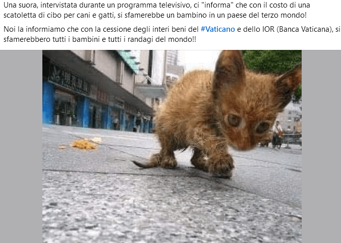 Ci segnalano i nostri contatti una condivisione virale per cui una suora ha davvero detto che con una scatoletta di cibo per cani e gatti si sfamerebbero i bambini del Terzo Mondo
