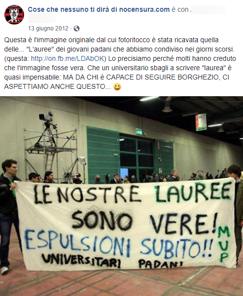 L’immagine, infatti, era stata scattata nell’aprile 2012 in occasione della festa dell’orgoglio leghista a Bergamo, coordinata da Alberto Ribolla. La versione fake ha ripreso a circolare nel maggio 2019, come dimostra il debunking operato dal Messaggero e dai colleghi di Butac. Gli Universitari Padani protestavano per esprimere il loro dissenso alla questione delle lauree di Renzo Bossi e per distaccarsi dalle generalizzazioni sugli appartenenti alla Lega Nord.
