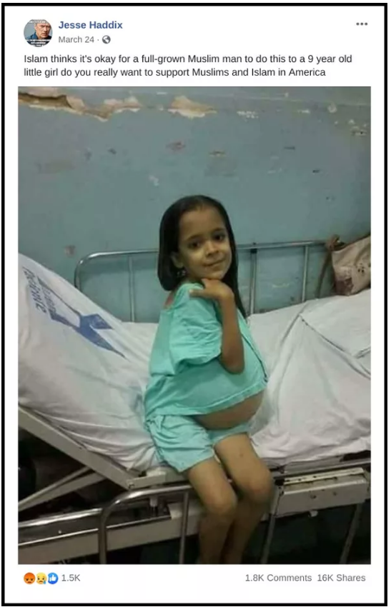 Questa è l’immagine di una bambina con fegato e milza ingrossati, ed è spesso utilizzata dai troll di Internet per diffondere false notizie, e spesso voci islamofobe. Il 24 marzo 2019, ad esempio, questa fotografia è stata condivisa con la falsa pretesa di mostrare una bambina di 9 anni che era stata messa incinta da un uomo musulmano:
