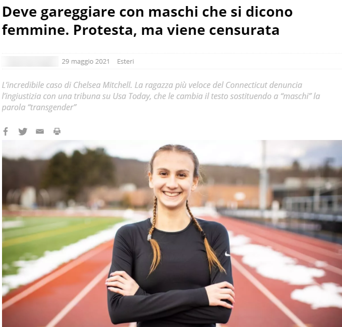 USA Today censura la parola “maschio” ritenendola offensiva? Il fatto viene riportato in Italia dal sito Tempi in questo articolo del 29 maggio 2021. Su USA Today è presente lo spazio “opinion” in cui i lettori possono esprimersi per segnalare ingiustizie, sfogarsi e tutto ciò che concerne l’opinione pubblica. Chelsea Mitchell, una giovane atleta del Connecticut, aveva pubblicato una sua riflessione sulla presenza di atleti transgender nelle gare femminili, una realtà che andrebbe a inficiare sulla sua competizione in quanto, aveva scritto Chelsea, gli uomini sarebbero fisicamente più avvantaggiati.