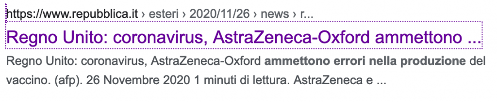 Un articolo di Repubblica titolato “Vaccino AstraZeneca, l’errore della mezza dose diventa un caso: “Ora servono altri studi” “ (ma inizialmente diffuso col titolo “Regno Unito: coronavirus, AstraZeneca-Oxford ammettono errori nella produzione del vaccino”) e uno del Sole 24 Ore “Covid, AstraZeneca farà un nuovo test dopo i dubbi sui dati del vaccino”.