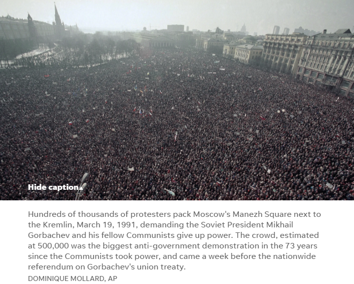 Centinaia di migliaia di manifestanti affollano piazza Manezh a Mosca, vicino al Cremlino, il 19 marzo 1991, per chiedere al presidente sovietico Mikhail Gorbaciov e ai suoi compagni comunisti di rinunciare al potere. La folla, stimata in 500.000, è stata la più grande manifestazione anti-governativa nei 73 anni da quando i comunisti hanno preso il potere, ed è arrivata una settimana prima del referendum nazionale sul trattato sindacale di Gorbaciov.