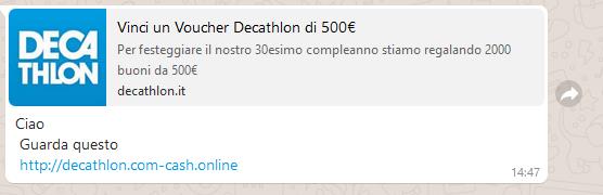 Come accaduto in passato la notizia non ha fondamento e potrebbe, addirittura, nascondere una truffa. Un utente ha segnalato il messaggio alla pagina Facebook dell’azienda: «Stanno girano catene whatsapp con buoni decathlon da 500€ Ne sapete nulla? Collegandosi a quel sito (che poi diventa decathlon.corn) vengono fatte alcune domande e alla fine viene detto “se vuoi ritirare il tuo buono invialo ad altri 20 amici etc etc”». È chiaro che nessuna azienda si serve di WhatsApp per le iniziative, e cogliamo l’occasione per ribadire che tutte le offerte vengono sponsorizzate attraverso i canali ufficiali (Facebook, sito internet, Twitter, Instagram ecc), e mai in forma privata con i singoli utenti.