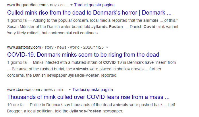 Cosa che è avvenuta in questo articolo. Cliccando il testo sui visoni zombi troviamo un’anticlimatica assenza di zombies ed una ingannevole assenza di COVID-19 e ritornanti. Peraltro archiviato alla voce “News Film”, come se fosse un immaginario film horror.